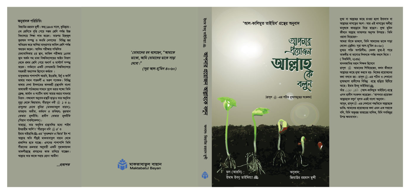 শাইখুল ইসলামের ‘আল-কালিমুত তাইয়িব’ গ্রন্থটির অনুবাদ প্রকাশ করতে পেরে আমরা সত্যিই আনন্দিত। আমরা সেই মহান আল্লাহর দরবারে শুকরিয়া আদায় করছি, যিনি আমাদেরকে দয়া করে কাজটি সমাপ্ত করার তাওফীক দান করেছেন। বইটির বিষয়বস্তুর প্রতি লক্ষ রেখে এর নাম দেওয়া হয়েছে “আপনার প্রয়োজন আল্লাহকে বলুন”। ইনশাআল্লাহ অতি শীঘ্রই বইটি পৌঁছে যাবে আপনাদের হাতে।