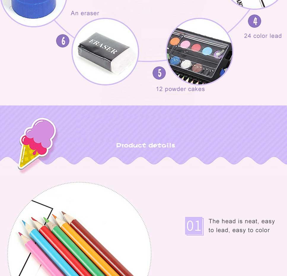 The product comes with 24 watercolor pens, 48 crayons, 48 oil pastels, 12 watercolor cakes, 24 color pencils, a bottle of glue, a long pencil, an eraser, a stapler, a pencil sharpener, a brush, a palette, and 5 pieces of drawing paper;